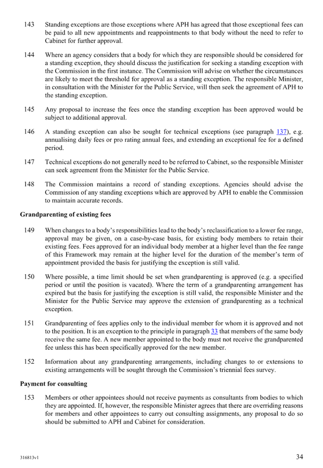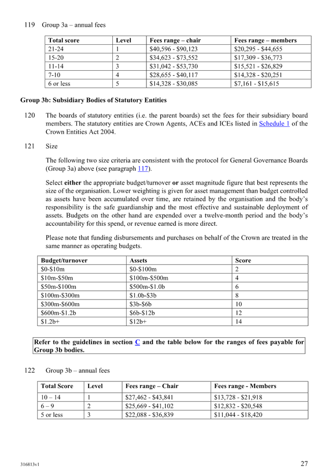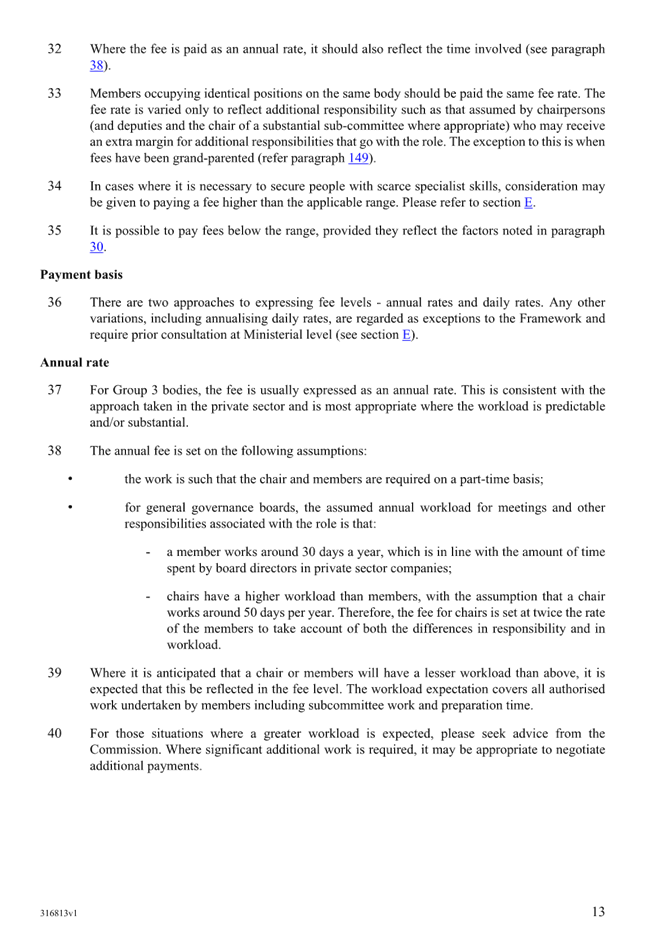 7 The Cabinet Fees Framework (Cabinet Framework) is revised every three years, with the latest revision having been published on 6 October 2022 (attached at Appendix 2). Any appointments made by Council to its committees and subcommittees align with “Group 4 – All Other Committees and Other Bodies” of the Cabinet Framework. The notable changes to the revised Cabinet Framework for this group are that an overall ten percent increase has been applied to all fees ranges, and deputy chairs or other non-elected members acting as the chair may receive the rate for the chair role.