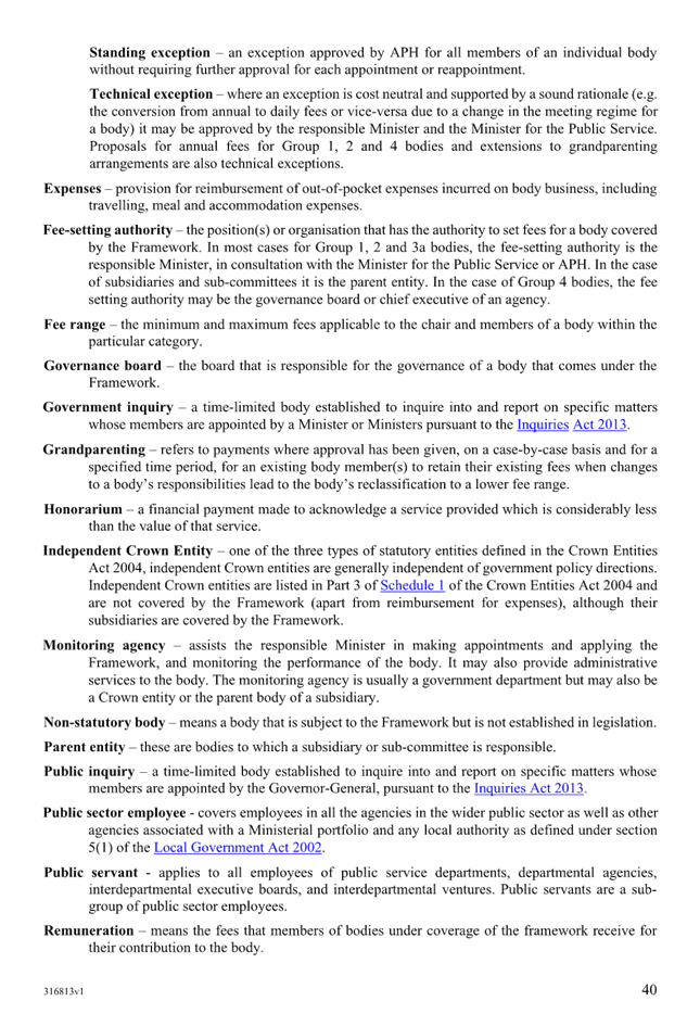 13 The updated Framework is not considerably different to the Framework in place for the last triennium but does reflect the changes provided for in the Cabinet Framework, i.e. that an overall ten percent increase has been applied to all fees ranges and deputy chairs or other non-elected members acting as the chair may receive the rate for the chair role. In addition, there is an increase to the meeting fees payable to non-elected members attending Te Whakaminenga o Kāpiti and A.R.T. Confederation meetings.