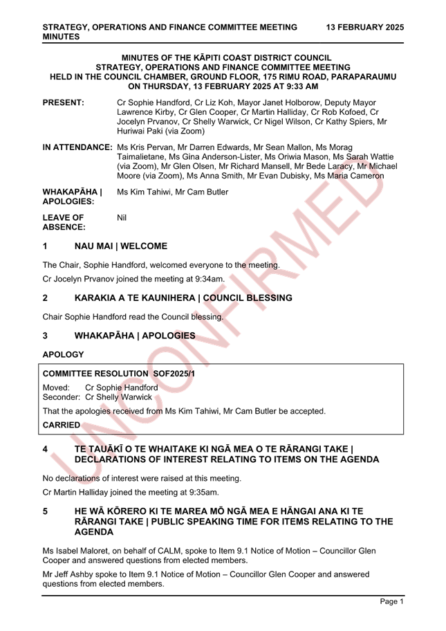 Notice is hereby given that a meeting of the Rautaki, Whakahaere, me te Ahumoni | Strategy, Operations and Finance Committee will be held in the Council Chamber, Ground Floor, 175 Rimu Road, Paraparaumu, on Thursday 13 March 2025, 9:30 am.